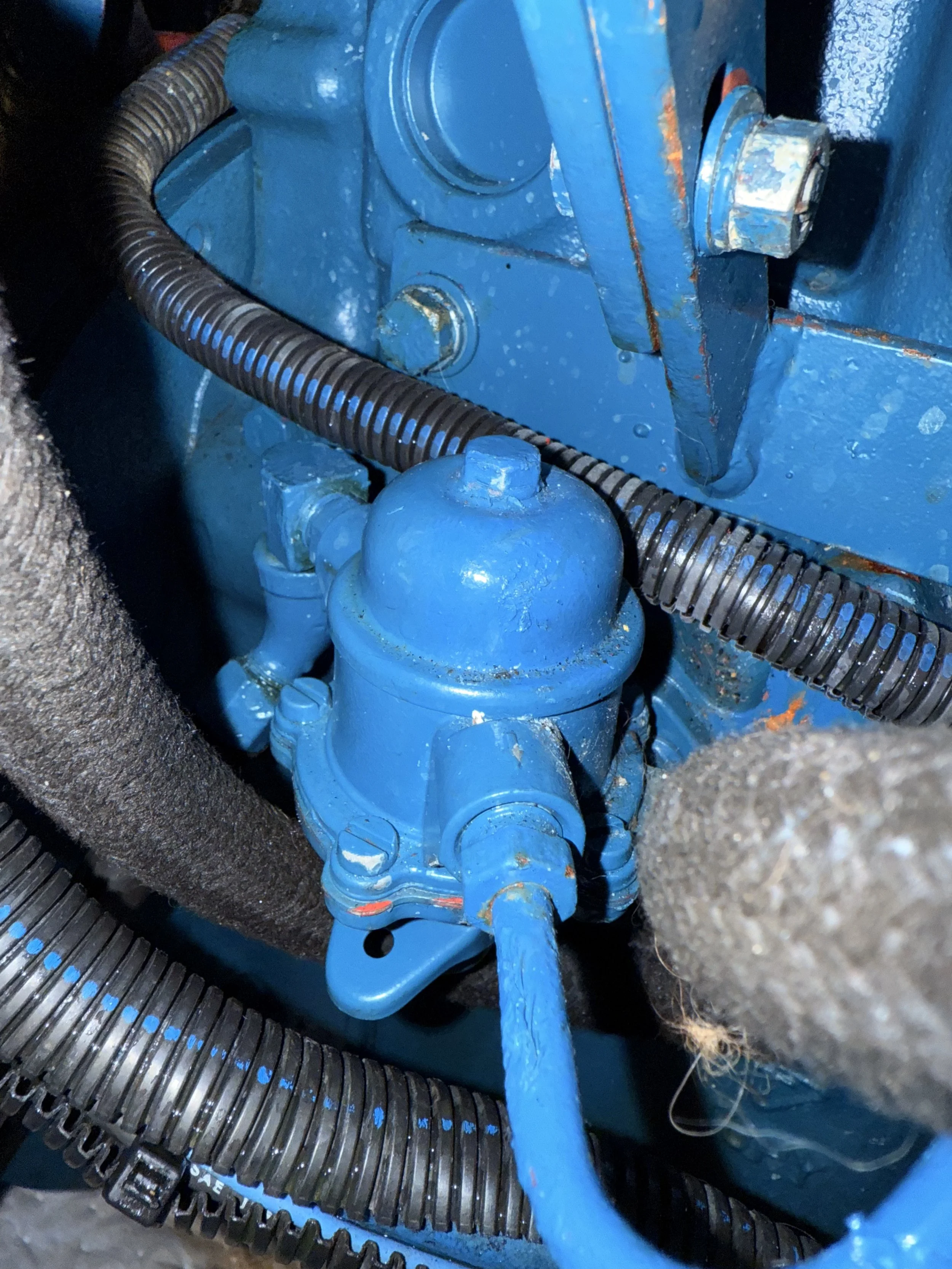 Once tied back up, Brenton and I spent an hour working on the engine, trying to bleed it - first cracking what we thought were the injectors, and then using the manual lift pump to try to remove any air that had gotten in. Bleeding a diesel can be tricky, and Perkins - we have a 4.236, installed in the late 1990s, and rebuilt in 2023 by Kim and Randy - are notoriously difficult. I kept going until the skin on my fingers wore through from the manual pump lever and then admitted defeat, at least temporarily.